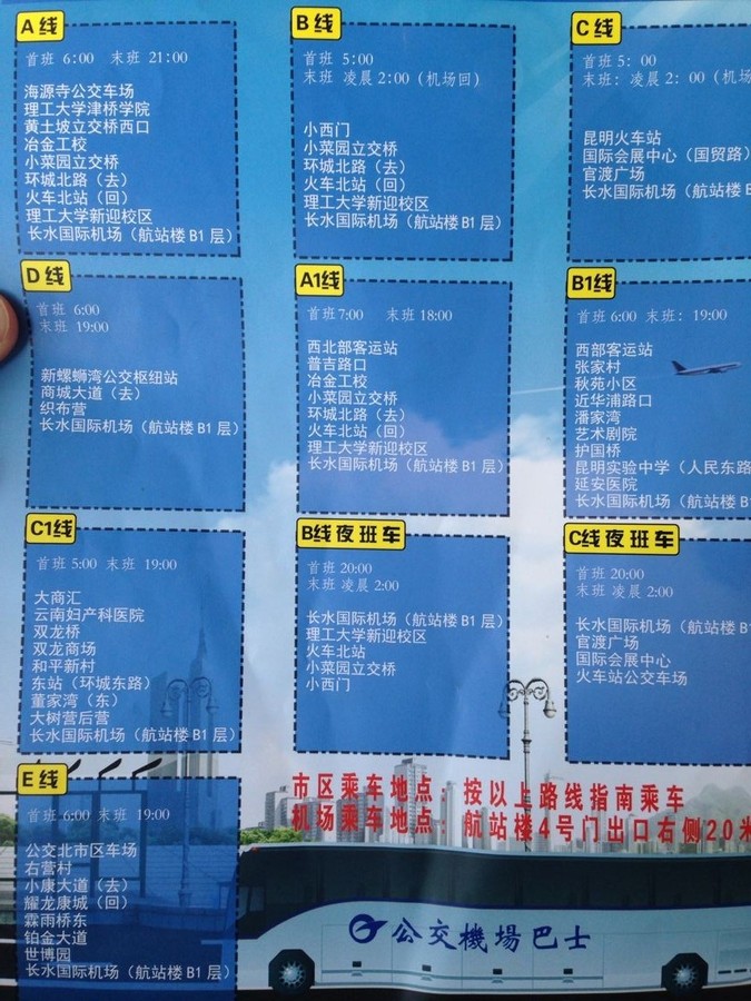 Dedicated bus line to Changshui International Airport. Buses run east through the city approximately every 45 minutes but scheduled times are less reliable than the Airport Express Bus. Tickets are 13 yuan and those with a bus card receive an additional 10 percent discount.